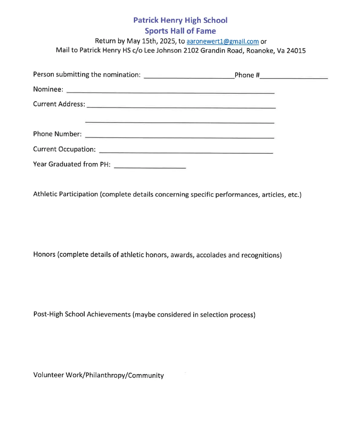 Contact PH Hall of Fame Chair Aaron Ewert for more details: [email protected]
